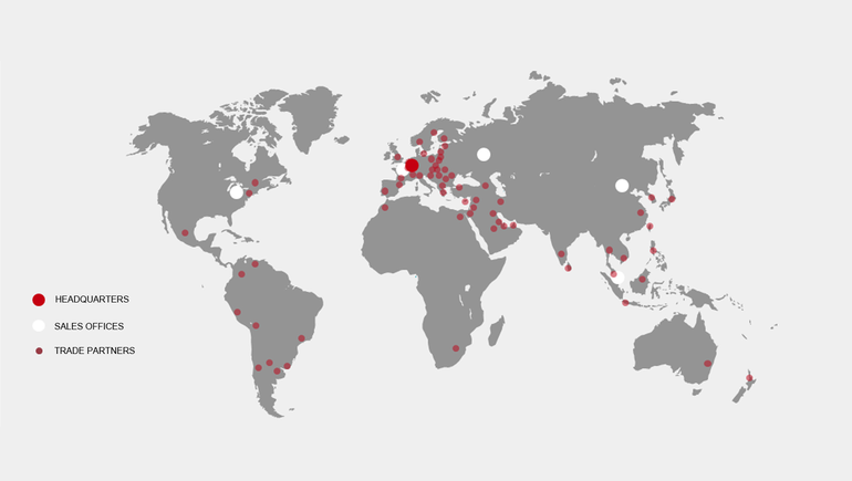 我们的网络遍布全球,公司总部设于伊达尔 - 奥伯施泰因,在美国、俄罗斯、新加坡和中国分别有四个销售办事处,有2位员工位于法国, 约有72家贸易伙伴处于世界各地主要经济区域。 但我们仍然努力进一步扩大我们的销售和服务网络,增加更多的销售办事处及合作伙伴,现场提供面向应用的咨询和技术服务,直接且方便。