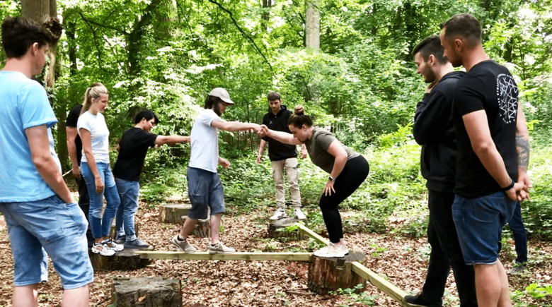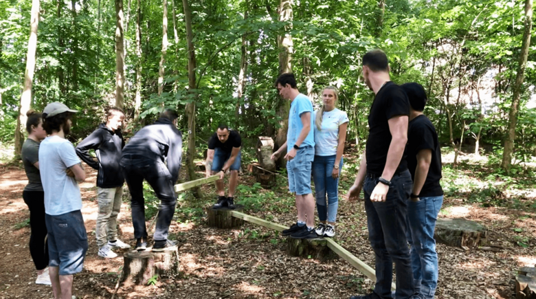 Once there, we found a lot to discover. Among other things, an adjacent forest filled with various facilities for teambuilding exercises. The rooms were settled and shortly afterwards the seminar of the Wicke Akademie began. Our seminar leader, Mr Linke, eased the tense atmosphere in just a few minutes, as some trainees hardly knew each other due to the separate departments and buildings. Monday was filled with varied team games in the forest. The first exercise, "seesaw", broke the ice and we all literally got closer to each other. The special thing about these exercises was the structure. Each exercise had a planning phase in which everyone could have their say and express ideas. Then the "execution phase" began, in which the exercise was carried out with a time limit, and finally there was always a discussion or feedback round about positive, but also negative things. More exercises followed, which often went very well, but also some in which we exceeded the time limit, for example. But we always continued until all trainees reached the goal of the exercise. There were also exercises that were carried out with a blindfold, which demanded extreme trust in the respective colleague, as we could only reach the goal together.