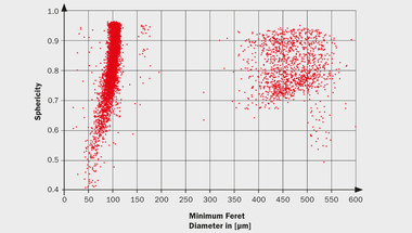 A decisive advantage of the Dynamic Image Analysis lies of course in the possibility that besides the basic determination of the diameter, also information about the geometry of the particles can be obtained. As one of the simplest shape parameters, the aspect ratio shall be mentioned here, which is yielded as the quotient from minimum to maximum Feret diameter.