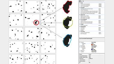 Now what can you do with all these obtained images? Initially of course the particle size can be determined. However the agony of choice starts here already: For example, during static light scattering only one value is given for the particle diameter, of course an imaging system offers different possibilities to define the diameter of a mostly irregularly shaped particle. Examples for this can be the area equivalent diameter (the diameter of a sphere, whose cross section has the same area as the evaluated particle), the diameter calculated from the particle circumference, or the so called Feret diameter, where two parallel lines on opposing sides of a particle are arranged so that they touch the particle, but don’t intersect the particle edge.