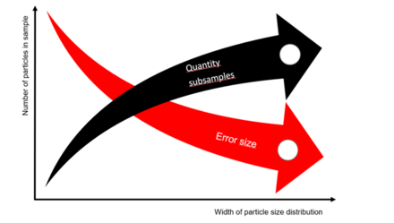 The goal of correct sampling is to minimize analysis variances. However, even well-mixed samples are subject to statistical variation. The confidence interval, i.e. the area around the mean value in which the sought true value is located with a given probability, can only be optimized by increasing the number of analyzed subsamples. The size of the statistical error of the sampling depends mainly on the sample size and the width of the particle size distribution. The fewer particles the sample contains and the wider the particle size distribution, the larger the error can become. Therefore, the number of characterized subsamples should increase with increasing heterogeneity of the total sample (Figure 3).