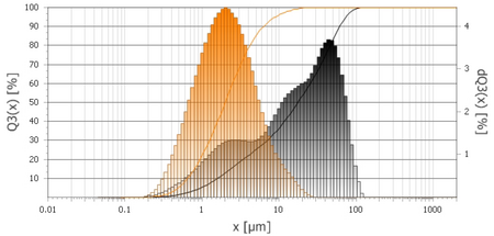 In further proceedings, in order to achieve a smaller final fineness, the grinding balls are exchanged step by step for smaller grinding balls. Here the degree of comminution should be checked via particle size analysis. The degree of comminution Z is a value from the chemical and mechanical process technology and offers information in regards how well a comminution process has worked.