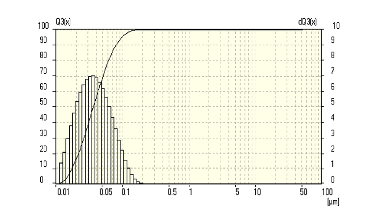 As a testing system we here present the comminution of aluminium oxide (Al2O3). The d50 value of the base material is 20 µm. 5 ml Al2O3 and along with water and 0.5 mm zirconium oxide balls are in 60 minutes ground down to approximately 300 nm. In order to reach the range of <100 nm, it is necessary to even utilize smaller grinding pearls. We use zirconium oxide pearls with a diameter of 0.1mm.