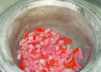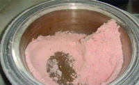 Already after a few minutes a fine homogenous powder is obtained. Here the tomato pieces are floating in the liquid nitrogen.