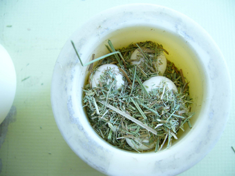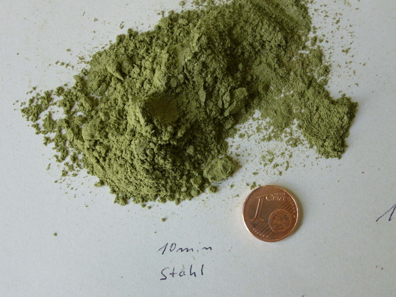 In additional tests with the Planetary Micro Mill PULVERISETTE 7 classic line, pre-crushed material was added and the steel grinding set used. After 10 minutes the grass was ground into powder like shown in the photo here: with the Planetary Ball Mill PULVERISETTE 7 classic line equipped with a steel grinding set. The grass is now a powder. Are 20 mg of this sample weighted in, it safely can be assumed, that a representative sample is added to the measuring instrument.