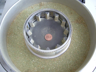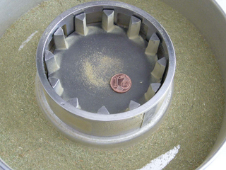 Due to the centrifugal acceleration of the mill an air current develops, which moves the blades of grass lengthwise through the sieve. The PULVERISETTE 14 was now equipped with various finer sieves and the material processed. The results remained unsatisfactory.